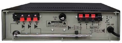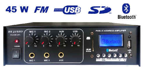 | Univerzální rozhlasová ústředna pro ozvučení meších prostor, např. restaurace, vinárna...se zabudovaným přehrávačem MP3 z USB nebo SD karty, s FM tunerem, Bluetooth a s dálkovým ovládáním. Má 2x vstupy pro mikrofon a univerzální vstup AUX. Každý vstup má samostatnou regulaci hlasitosti. Výstupy na perové svorky 100V, 70V, 4, 8, 16V. | ||||||||||||||||||||||||||||||||||