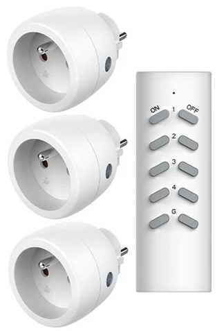 Sada bezdrátově ovládaných zásuvek obsahuje 4 kanálový dálkový ovladač a 3 kusy dálkově ovládané zásuvky 230V. Sada je určena pro dálkové zapínání a vypínání elektrických spotřebičů na 230V: např. osvětlení, audio-video zařízení, větráky, čerpadla ap. Pomocí dálkového ovladače díky radiovému přenosu můžete zapínat a vypínat zásuvku i přes překážky, jako zdi nebo nábytek. Ale pozor, při průchodu ovládacího signálu přes překážky se dosah zařízení snižuje, třeba i na 1/3 dle vlastnosti překážky pro útlum radiových vln. Dálkovým ovladačem můžete ovládat až 4 zásuvky. Obsahuje 4 páry tlačítek pro zapnutí a vypnutí jednotlivých zásuvek 1 až 4 a dále pár tlačítek na současné zapnutí nebo vypnutí všech zásuvek. Maximální zatížení zásuvky je 3680 W/16 A. Zásuvky lze ovládat také ručně tlačítkem ON-OFF. Spárování zásuvky s požadovaným tlačítkem 1 až 4 se provádí automaticky během učícím režimu zásuvky. Jedním dálkovým ovladačem můžete ovládat nezávisle až 4 zásuvky |