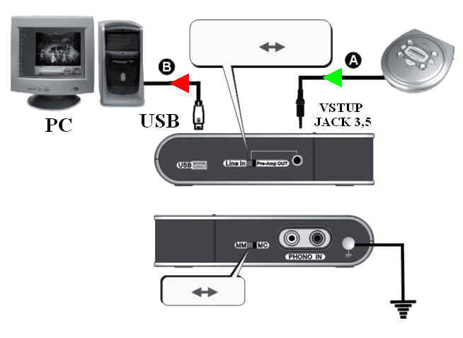 zelená šipka směr analogového signálu, červená šipka ukazuje směr digitálního signálu.z USB do PC | ||||||||||||||||||||||||||||||||||