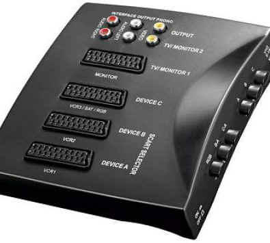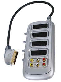 | Jednoduchý mechanický přepínač umožňuje přepínaní 4 zdrojů audio/video signálů do vstupu televizoru Přepínání mezi zdroji signálu jako VIDEO, DVD , CD, SAT, PLAYSTATION atd. realizujete pomocí tlačítek A,B,C a D, přepínače jsou na boku panelu. Všechny konektory jsou SCART, u vstupu D jsou navíc i konektory 3CINCH (video a audio R+L). Výstup je přes vidlici SCART na kabelu 0,5m.a zastrčí se rovnou do TV. Na panelu je i druhý výstup s konektory CINCH. Tento AV přepínač je pasivní, neobsahuje žádnou elektroniku | |||||||||||||||||||||
