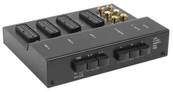 | Jednoduchý mechanický přepínač umožňuje přepínaní 4 zdrojů audio/video signálů do vstupu televizoru Přepínání mezi zdroji signálu jako VIDEO, DVD , CD, SAT, PLAYSTATION atd. realizujete pomocí otočného přepínače. Panel je vybaven mechanickým indikátorem připojeného vstupu - obsahuje 4 okénka 1,2,3 a 4 ve kterých se pohybuje červený ukazatel. Červené okénko informuje, který vstup je připojen. Všechny konektory jsou CINCH. Neobsahuje žádnou elektroniku. Pultí má na zadní straně výstup a 3 vstupy, na přední straně je čtvrtý vstup pro připojení kamery | |||||||||||||||||||||