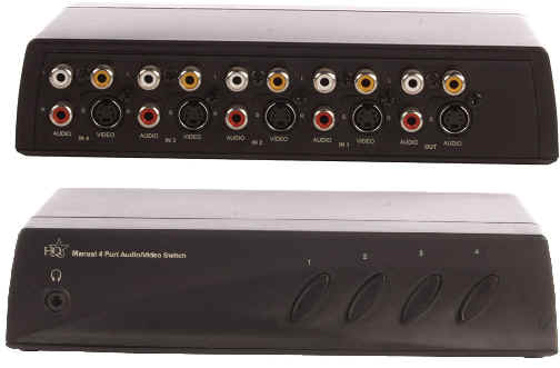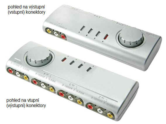 | Tento přepínač umožňuje přpojení až 4 přístrojů (VIDEO. DVD, SAT, SET-TOP-BOX) do jednoho vstupu TV. Umožňuje přepínaní až 4 zdrojů signálu S-VIDEO nebo AV (3CINCH video+R+L). Má dvojitý výstup s konektory S-VIDEO nebo AV 3xCINCH. Na předním panelu je konektor JACK3,5 pro sluchátka. Můžete rychle a snadno zvolit, který zdroj audio/video signálu budete používat, Přepínání mezi zdroji signálu např. VIDEO, DVD, CD SAT, přepínáte pomocí tlačítek na předním panelu. | ||||||||||||||||||||||