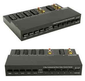 | Profesionální mechanický AUDIO/VIDEO přepínač umožňuje propojení až 6 přístrojů s konektory SCART , případně CINCH a S-+video. (TV, SAT, DVD, PC, AUDIO, SET-TOP-BOX aj.) Má 5 vstupů a dva výstupy. Vstupy 1,2,3,4 a 5 můžete přepínat ručně díky pěti tlačítkům na předním panelu, můžete si vybrat jeden z pěti vstupů. Vstup 1 je také určen k nahrávání (videorecorder, DVD), Pomocí dalších 4 tlačítek můžeme na SCART1 připojit signál ze vstupů 2,3,4 nebo 5 a tím si vybrat, z kterého přístroje budeme nahrávat. Přepínací pultík je masivní a kovový | ||||||||||||||||||||||||||||||