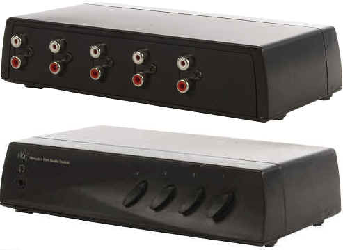 | mechanický přepínací audio pultík umožňuje přepínání až čtyř stereo signálů (např.MGF, CD, GRAMO a TUNER) do jednoho vstupu zesilovače pouhým otočením knoflíku. Otočný přepínač, má 4 polohy 1, 2 , 3 a 4. Kovový pultík má na zadní straně tyto konektory, 1x JACK3,5 a 3 páry CINCH pro vstupy a jeden pár CINCH (RCA) pro výstup. Levý a pravý kanál je barevně odlišen, červené a bílé konektory. Přepínač je možné zapojit i jako rozbočovač - 1 signál můžeme přepínat na jeden ze tří zesilovačů. | ||||||||||||||||||||||||||||