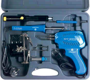 příslušenství: 100W páječka vč. náhradního hrotu, 30W ruční páječka vč. odkládací plochy a poniklovaného hrotu, třetí ruka se stabilním stojanem a přesnými svorkami, odsávačka s výměnnou čepelí (190 mm dlouhá, průměr 20 mm), čistící miska, pájecí drát o průměru 1,2 mm, S-Sn60Pb40 s ca 2% tavidla |
