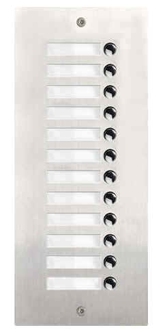 Rozšiřující vstupní panel s 12 tlačítky k ploché kamerové jednotce PDJ4TIDF, venkovní provedení, má podsvícené jmenovky. Jednotka je určena k montáži do zdi, součástí panelu je i montážní krabička. S jednotkou PDJ4TIDF se propojuje kablíkem s konektorem. Pro montáž na zeď s montážní krabicí |