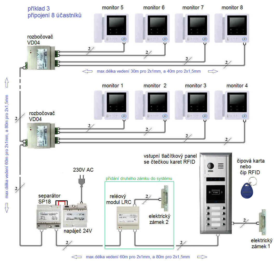 celkové zapojení dvouvodičového videovrátného pro 8 bytů (možnost připojení 2.zámku) Digitální systém easydoor využívá k propojení jednotlivých částí pouze dvoulinku (kroucený pár) Tato dvouvodičová sběrnice zajišťuje napájení, přenos video i audio signálu i povely na otevírání zámku. Vstupní jednotka je napájena ze separátoru SP18. Maximální délka vedení mezi vstupní jednotkou a separátorem závisí na průřezu vodiče a je 60 až 80m dle použitého kabelu (2x1mm nebo 2x1,5mm). Pro potřebu ovládání 2.zámku můžeme vložit do vedení reléový modul. Nízkoodběrové zámky 12V/.300mA můžeme napájet přímo ze systému. Pro zámky z vyšším odběrem je nutný přídavný napáječ pro zámky a jednotky easydoor fungují jako spínací relé. Vstupní panely se čtečkou RFID mohou otevřít zámek přiložením karty nebo čipu. |